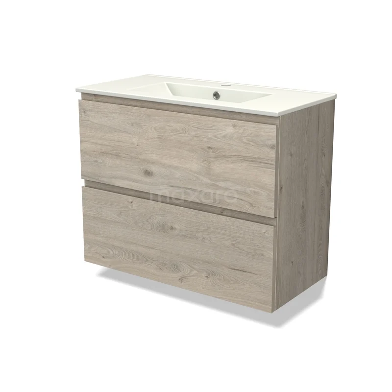 Modulo Slim Bathroom furniture with sink | 80 cm Light grey oak Handle-less front Ceramic 2 Stacked drawers