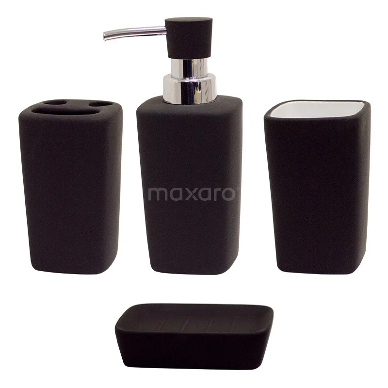 The Edge accessory set equips your bathroom with accessories that match beautifully. This set includes a toothbrush holder, soap dispenser, drinking cup and soap dish. Featuring a sleek design with a black finish, the accessories add an eye-catching touch to your interior. Besides being functional, this accessory set is a stylish addition to the room.