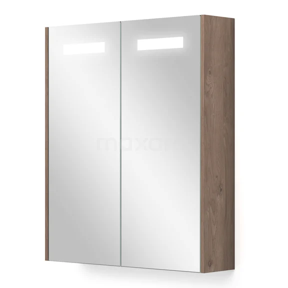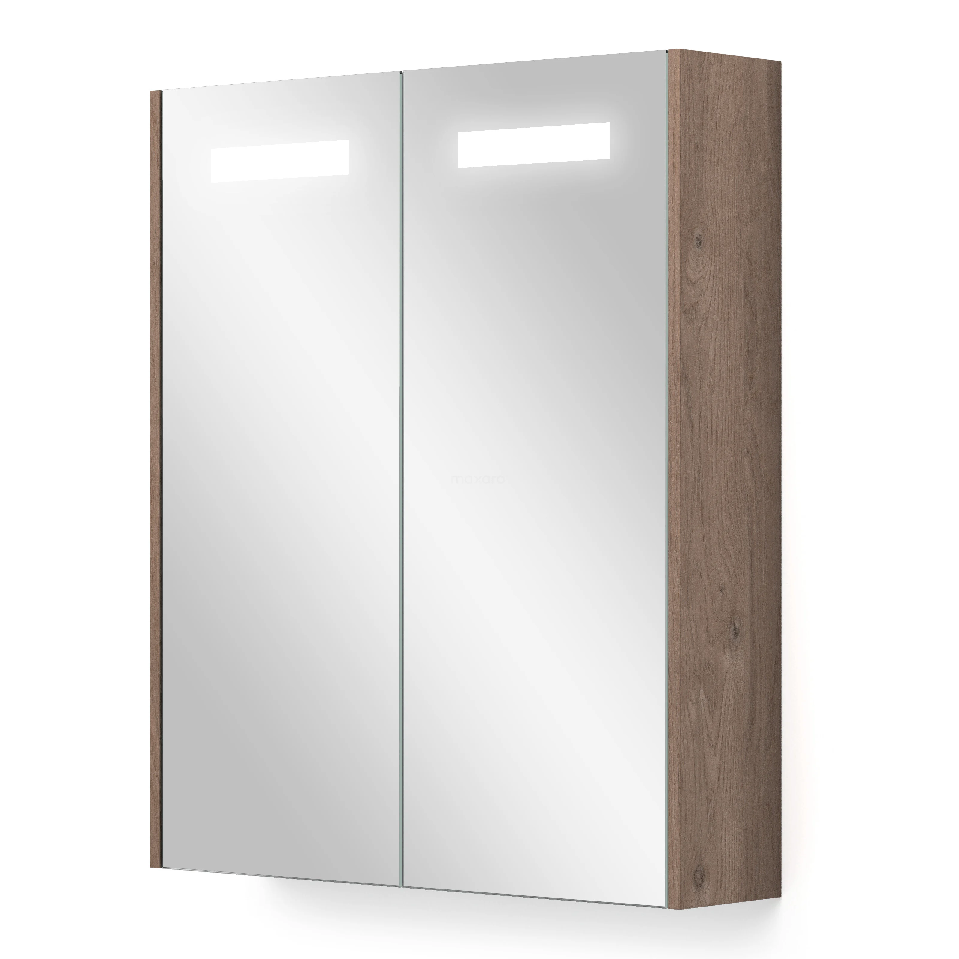 This stylish mirror cabinet has a rectangular design and is finished in medium brown oak. This colour perfectly matches your Modulo bathroom furniture and is a beautiful addition to your interior. The lighting gives the whole a cosy appearance and can be operated with a switch. You can also adjust the colour temperature as desired.