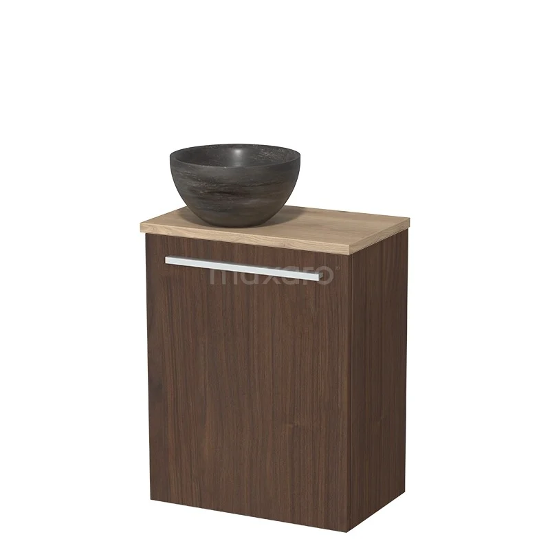 Houten badkamerkast met lade, moderne wastafel en donker keramieken kom, ideaal voor een stijlvolle badkamerinrichting.