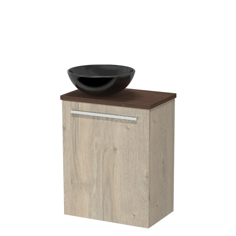 Houten badkamerkast met zwart keramische kom, compact ontwerp, ideaal voor moderne badkamerinrichtingen.