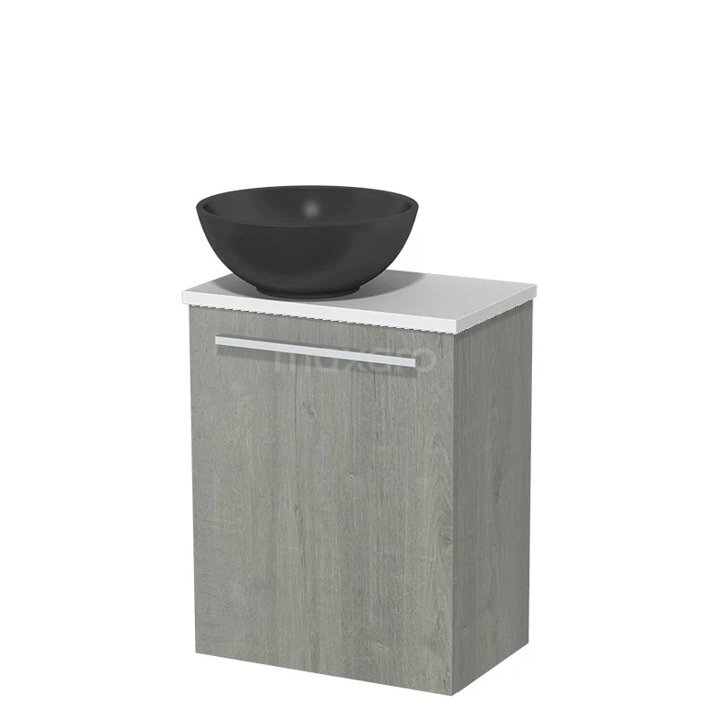 Toilet unit with countertop wash basin | 41 cm Grey oak Flat front Matte black Quartz worktop High-gloss white worktop