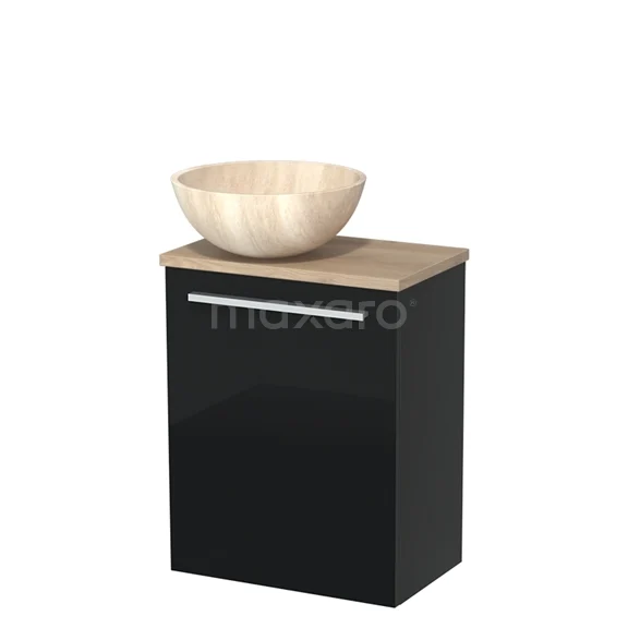 Toilet unit with countertop wash basin | 41 cm High-gloss black Flat front Travertine Natural stone countertop wash basin Light brown oak worktop