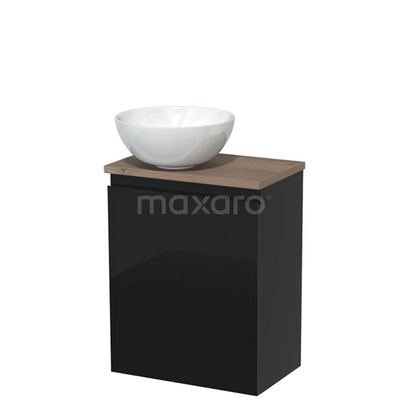 Toilet unit with countertop wash basin | 41 cm High-gloss black Handleless front High-gloss white Ceramic wash basin Mid brown oak worktop