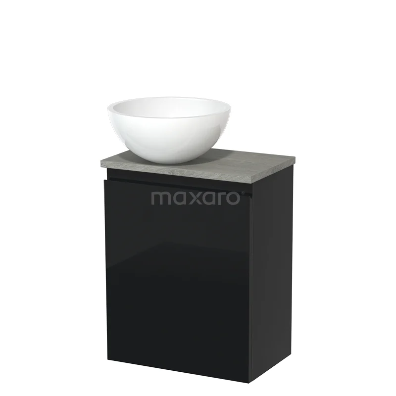 Toilet unit with countertop wash basin | 41 cm High-gloss black Handleless front High-gloss white Mineral marble worktop Grey oak worktop