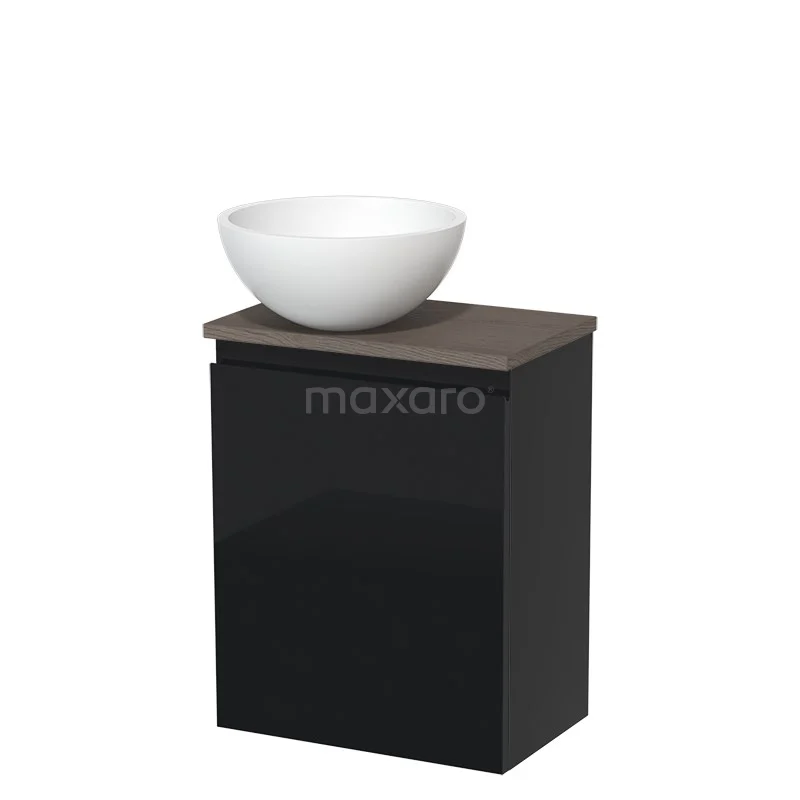 Toilet unit with countertop wash basin | 41 cm High-gloss black Handleless front Matte white Solid surface wash basin Dark brown oak worktop