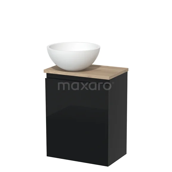 Toilet unit with countertop wash basin | 41 cm High-gloss black Handleless front Matte white Solid surface wash basin Light brown oak worktop