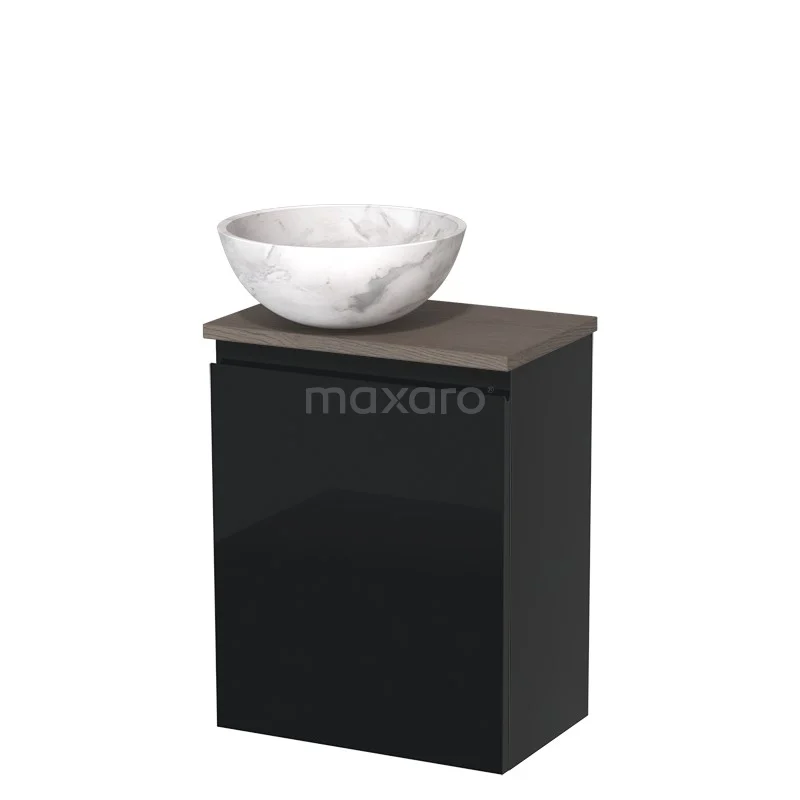 Toilet unit with countertop wash basin | 41 cm High-gloss black Handleless front White marble Natural stone worktop Dark brown oak worktop