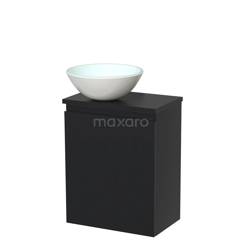 Toilet unit with countertop wash basin | 41 cm Matte white Handleless front Matte white Glass wash basin Frosted glass Worktop Black