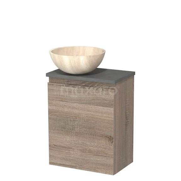 Toilet unit with countertop wash basin | 41 cm Oak Handleless front Travertine Natural stone basin Dark grey concrete worktop