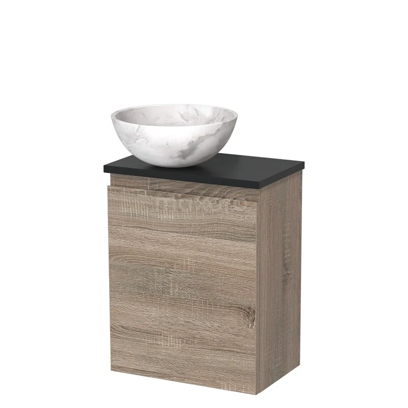Toilet unit with countertop wash basin | 41 cm Oak Handleless front White marble Natural stone worktop Matte black worktop