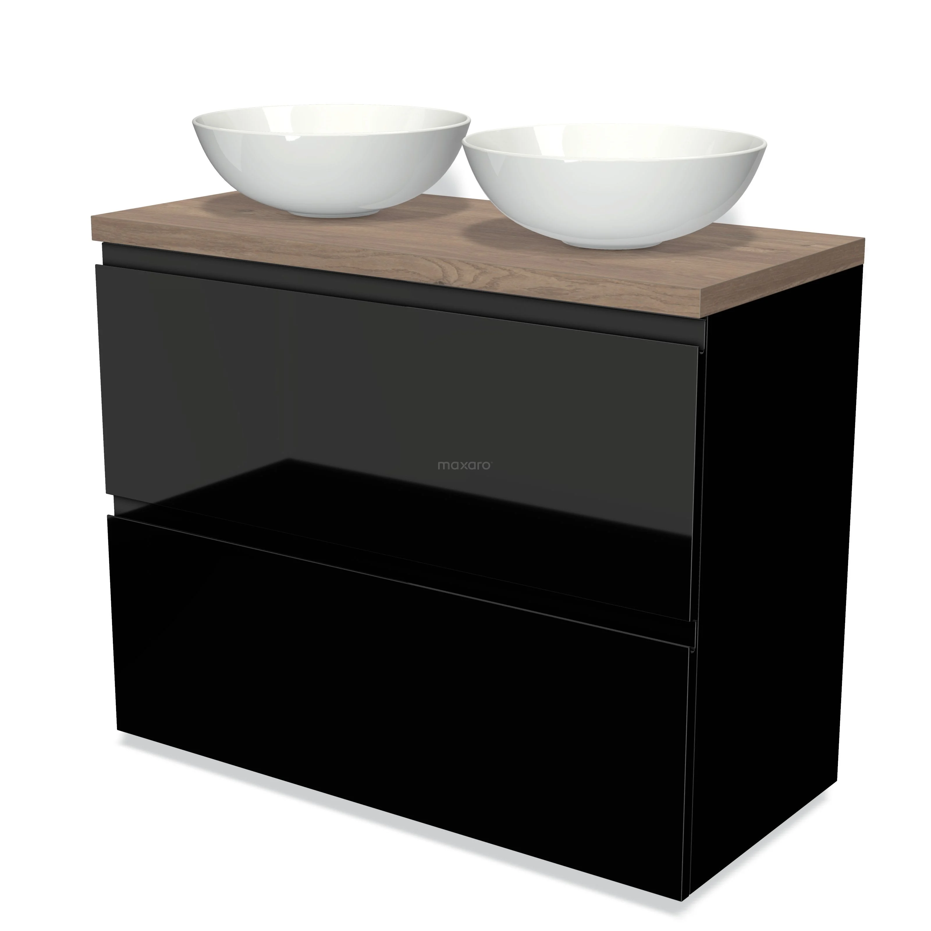 Modulo Plato Vanity units for countertop basin | 100 cm High-gloss black Handle-less front Mid brown oak worktop 2 stacked drawers under each other