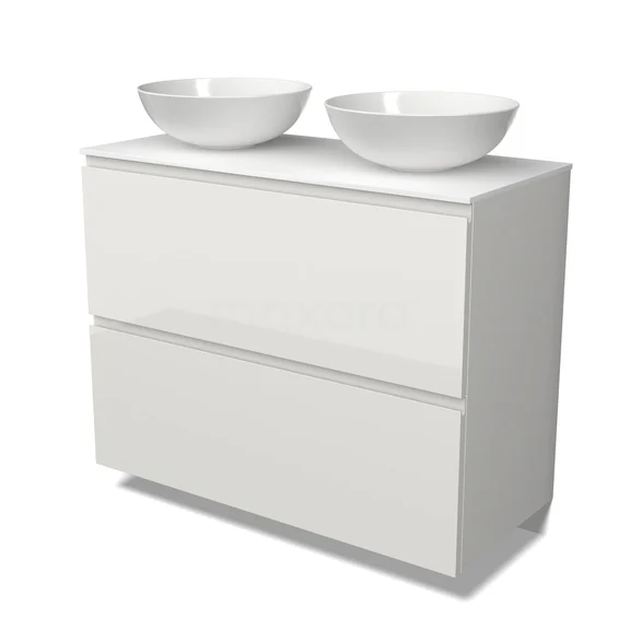 Modulo Plato Vanity units for countertop basin | 100 cm High-gloss white Handle-less front Solid surface worktop 2 stacked drawers under each other