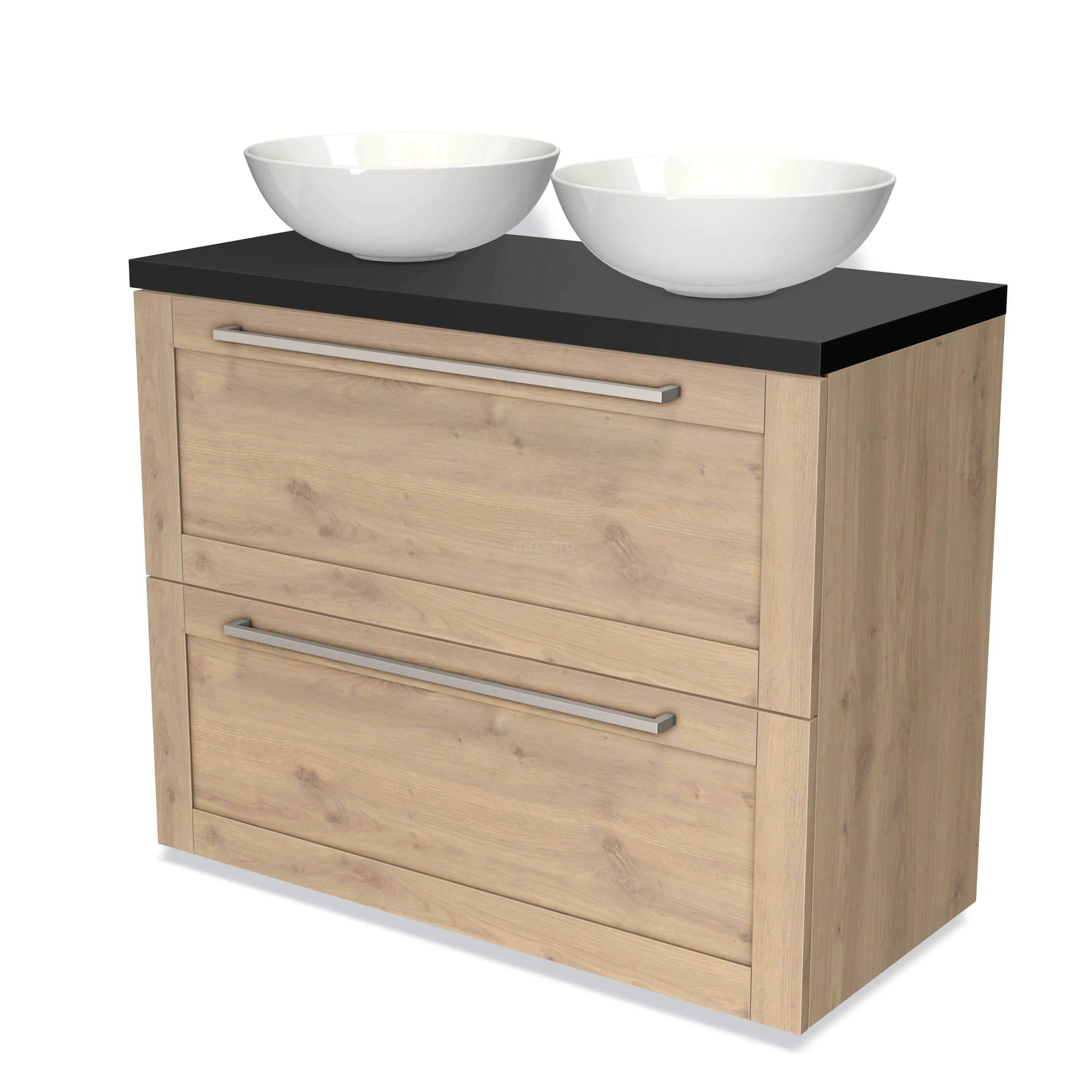 Modulo Plato Vanity units for countertop basin | 100 cm Light brown oak Frame front Matte black worktop 2 stacked drawers under each other
