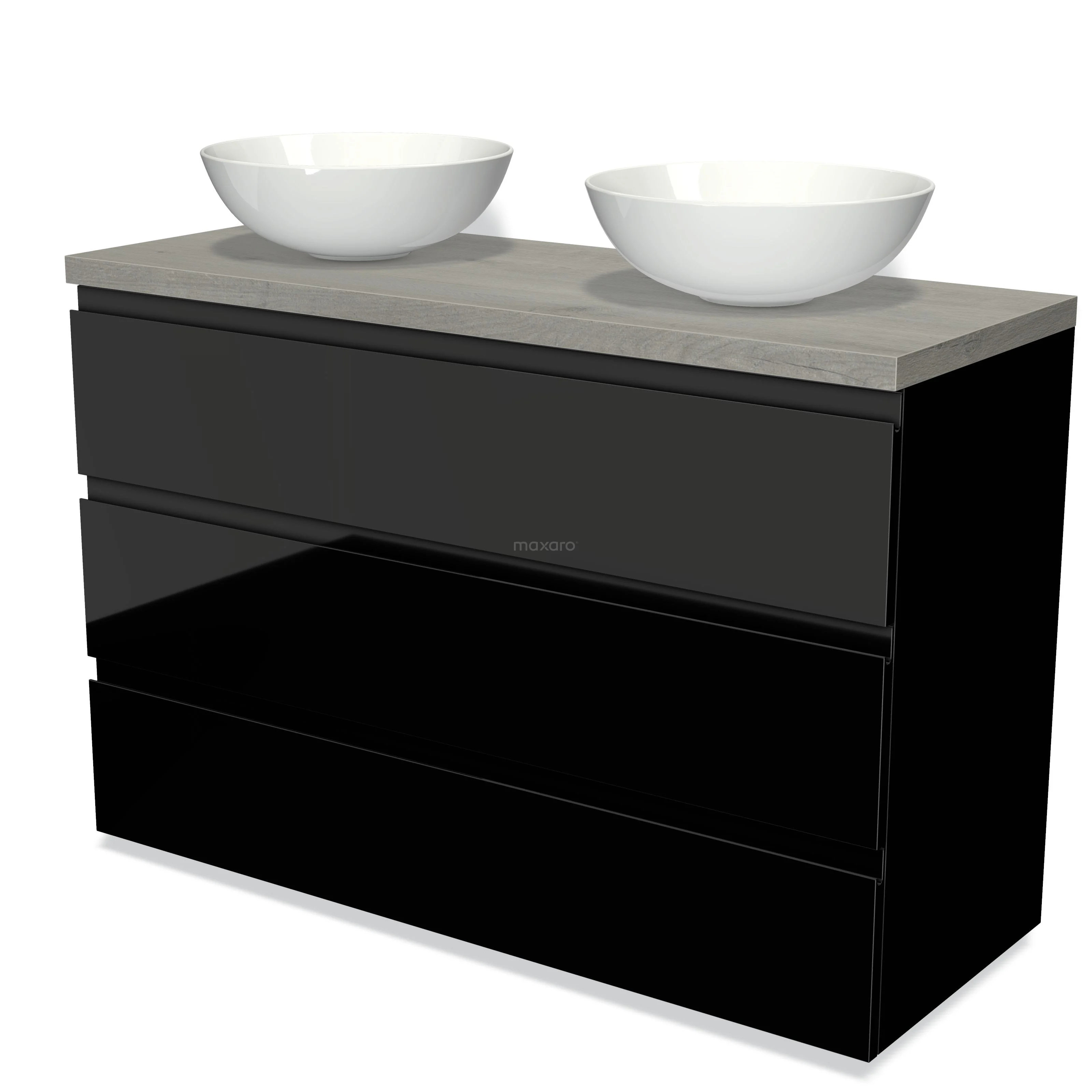 Modulo Plato Vanity units for countertop basin | 120 cm High-gloss black Handle-less front Grey oak worktop 3 drawers