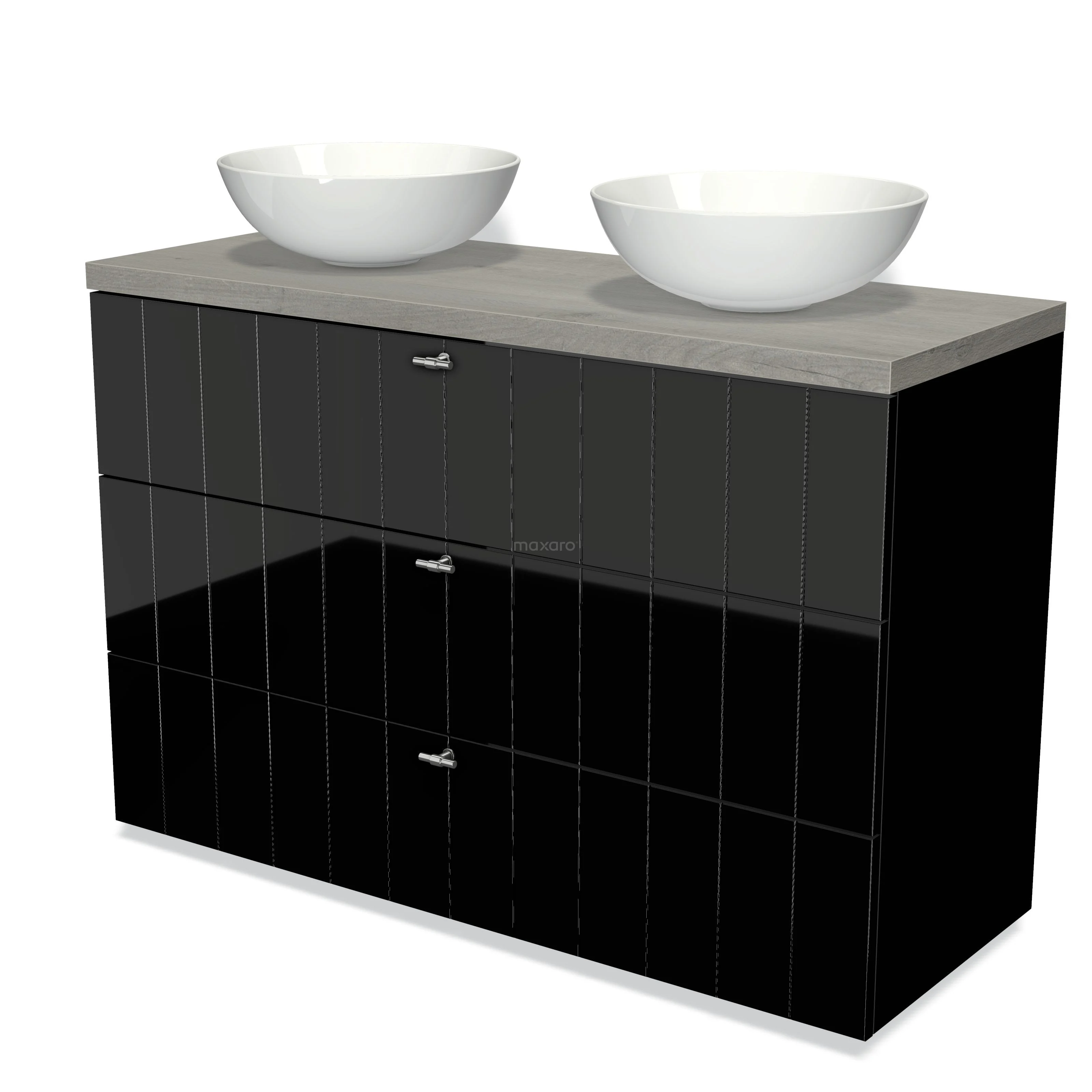Modulo Plato Vanity units for countertop basin | 120 cm High-gloss black Slat front Grey oak worktop 3 drawers
