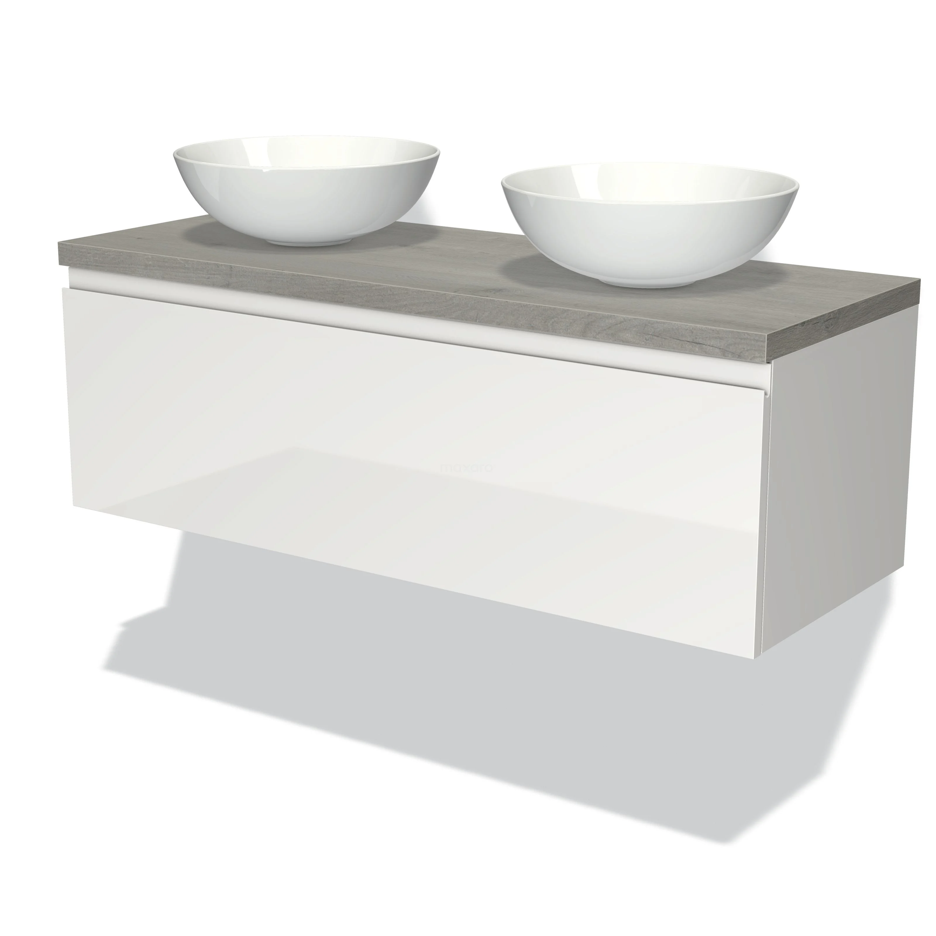 Modulo Plato Vanity units for countertop basin | 120 cm High-gloss white Handle-less front Grey oak worktop 1 drawer