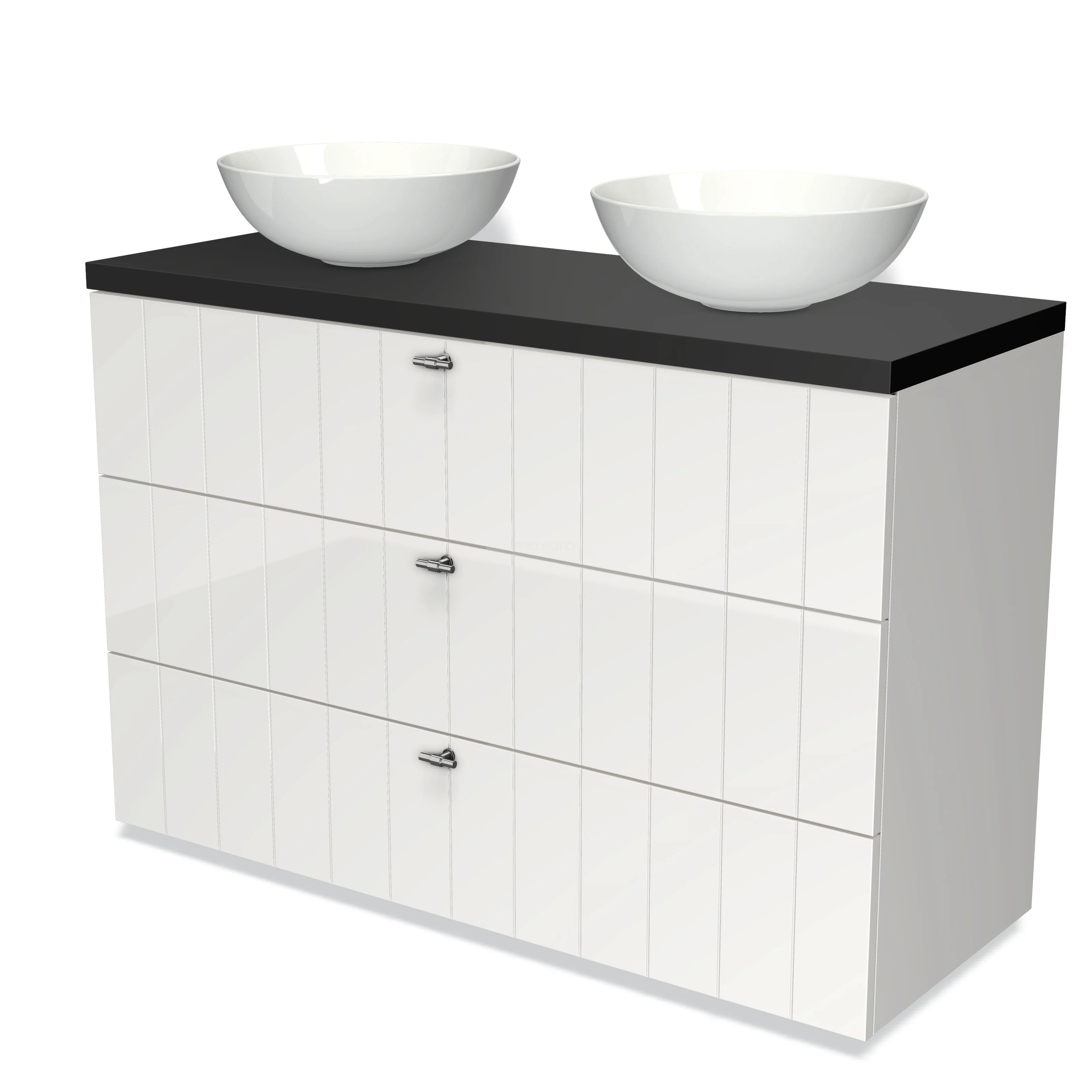 Modulo Plato Vanity units for countertop basin | 120 cm High-gloss white Slat front Matte black worktop 3 drawers