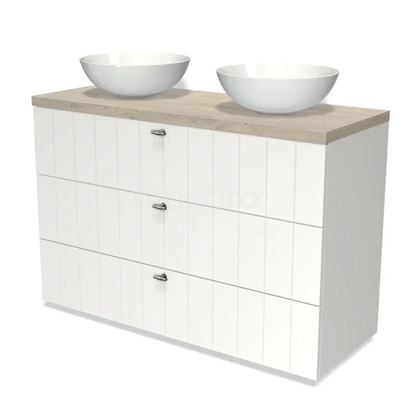 Modulo Plato Vanity units for countertop basin | 120 cm Matte white Slat front Light grey oak worktop 3 drawers