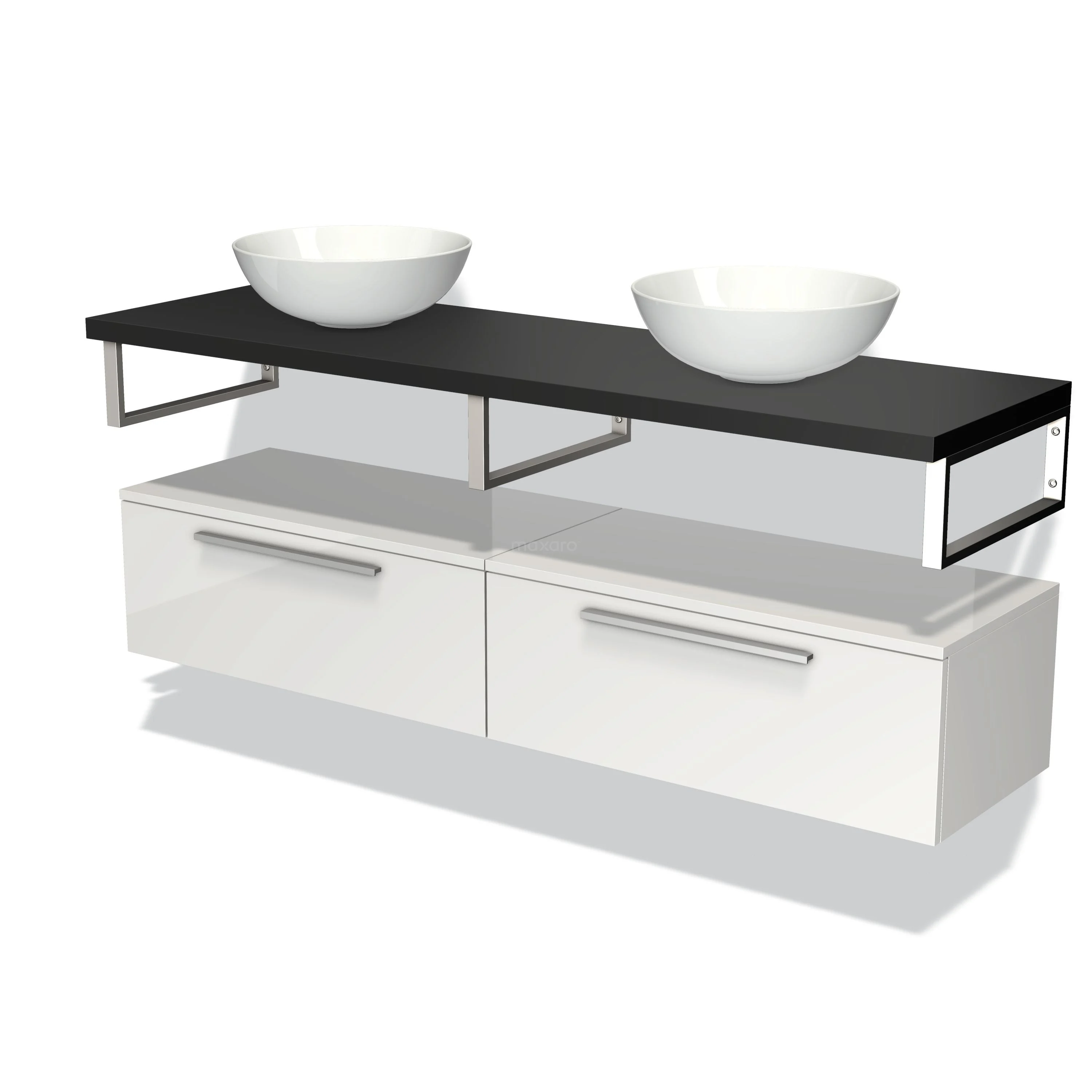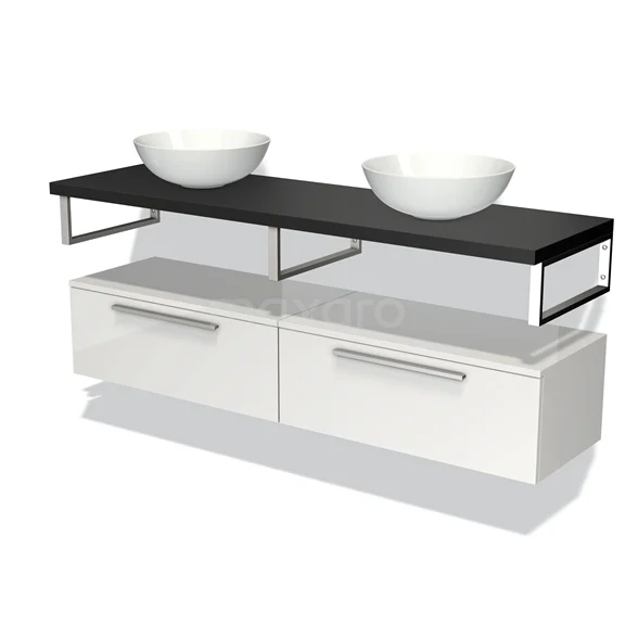 Modulo Plato Vanity units for countertop basin | 160 cm High-gloss white Flat front Matte black worktop Low floating