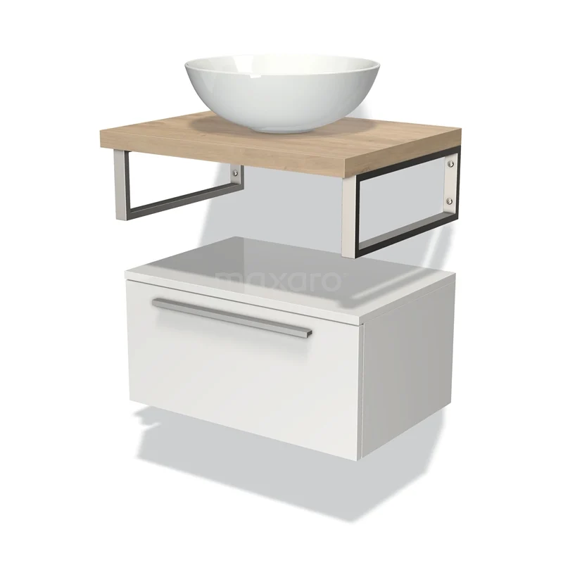 Modulo Plato Vanity units for countertop basin | 60 cm High-gloss white Flat front Light brown oak worktop Low floating