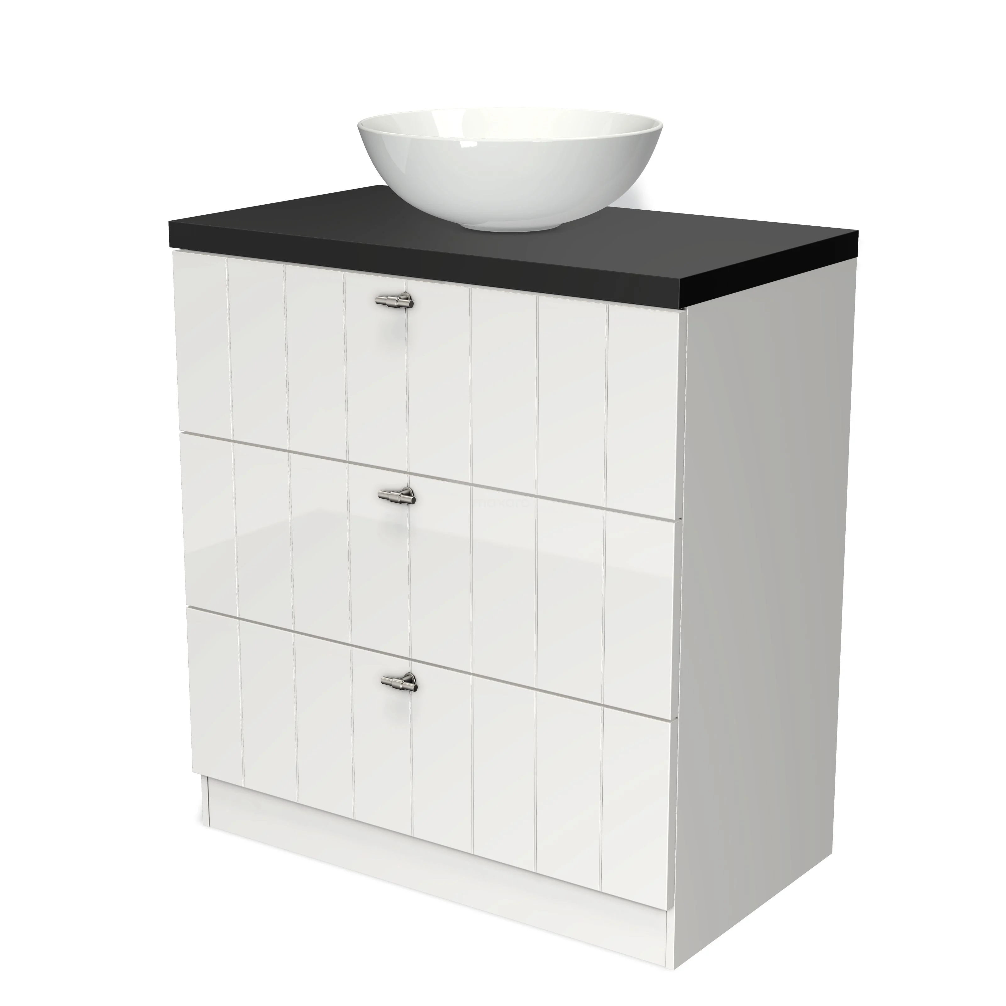 Modulo Plato Vanity units for countertop basin | 80 cm High-gloss white Slat front Matte black worktop 3 standing drawers