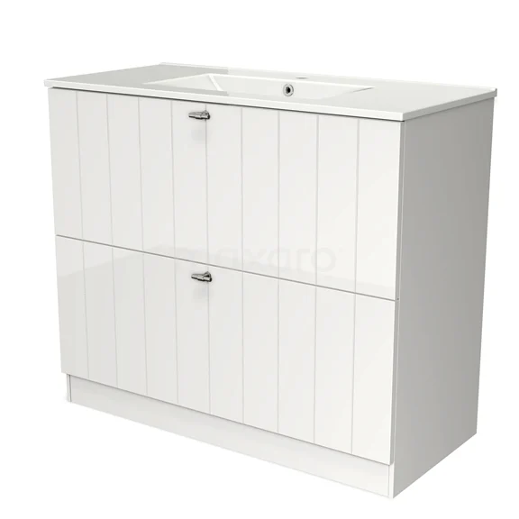 Modulo Bathroom furniture with sink | 100 cm High-gloss white Slat front Ceramic 2 high drawers standing drawers under each other