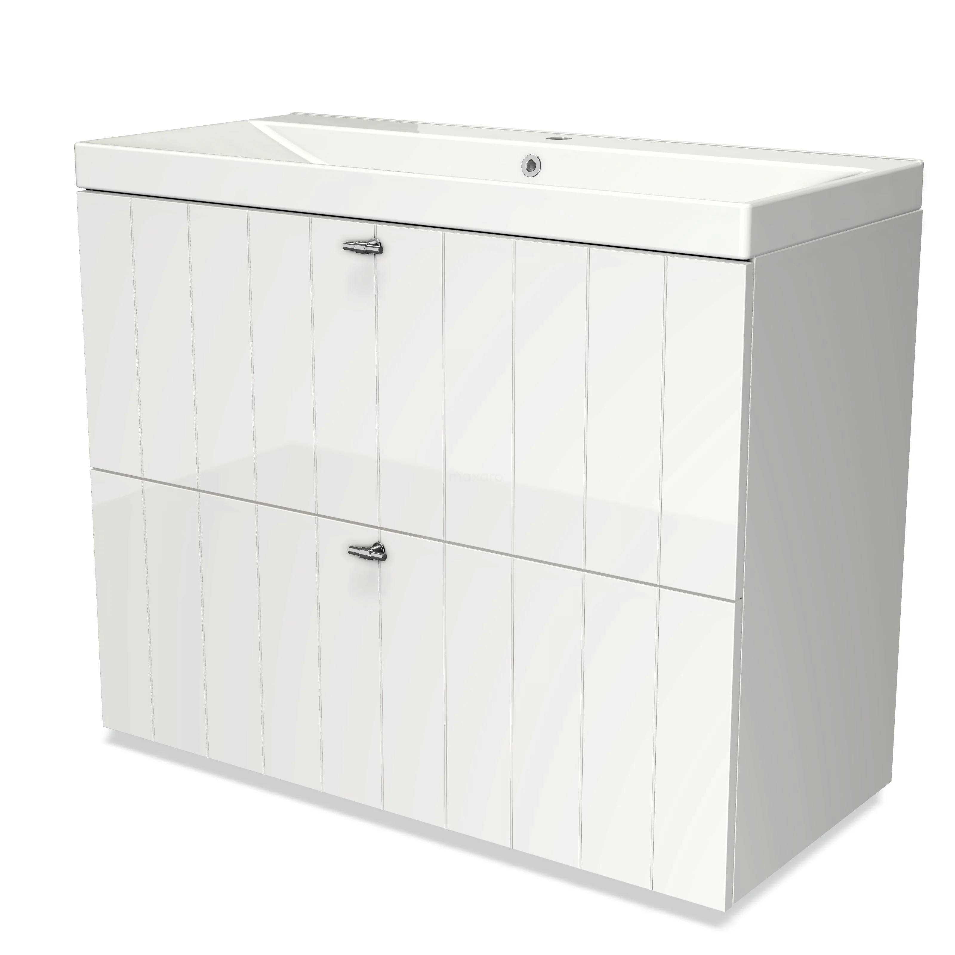 Modulo Bathroom furniture with sink | 100 cm High-gloss white Slat front Ceramic 2 stacked drawers under each other