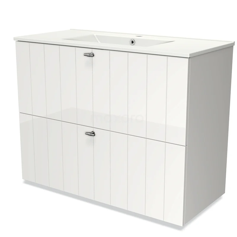 Modulo Bathroom furniture with sink | 100 cm High-gloss white Slat front Ceramic 2 stacked drawers under each other