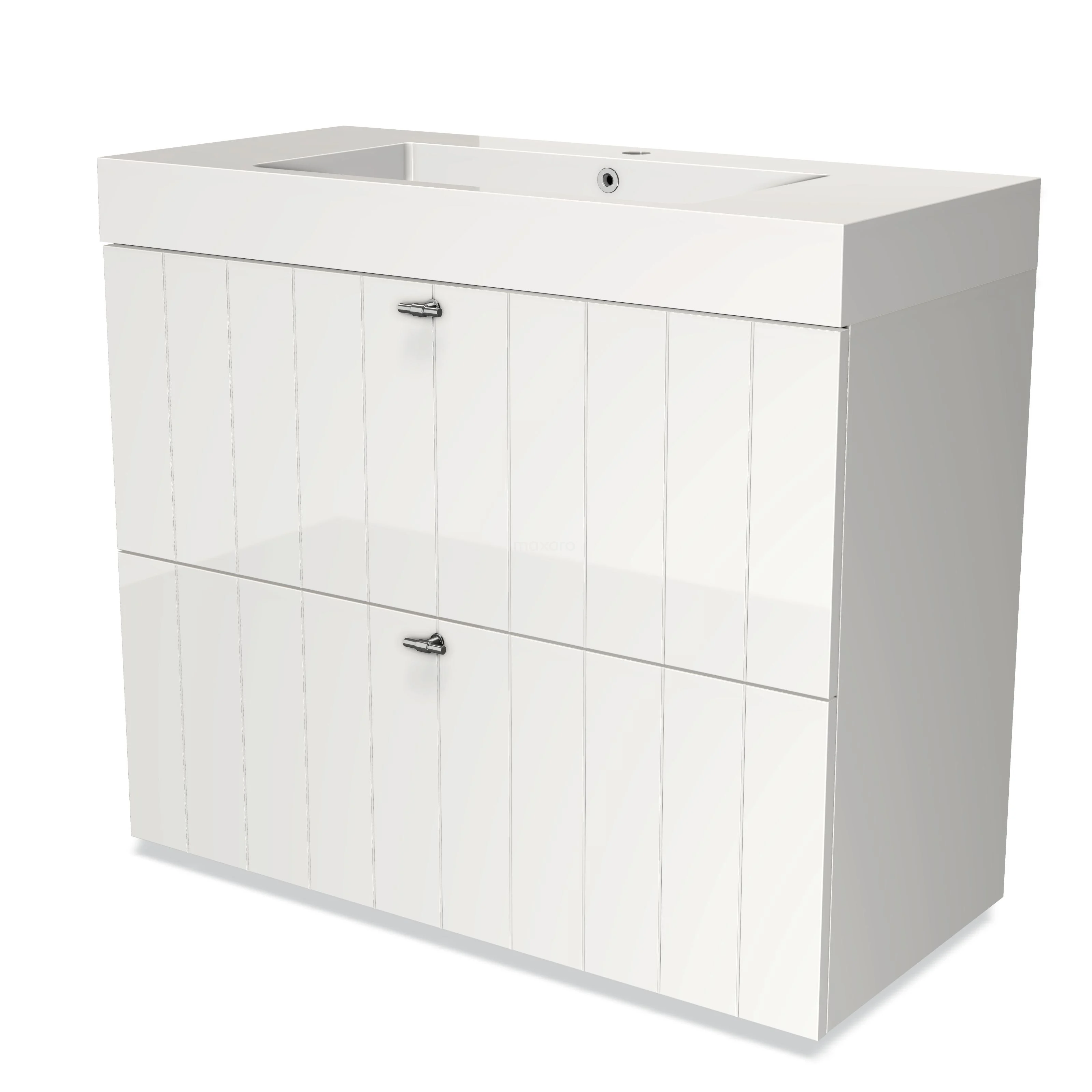 Stylish design The stylish design makes this bathroom unit the eye-catcher of your bathroom. The base cabinet features a slatted front and has a high-gloss white finish. This colour has a modern appeal and gives the unit a fresh look and feel. In addition, the slatted front adds a rural touch. You need to add the handles yourself. These are available in different colours and shapes.