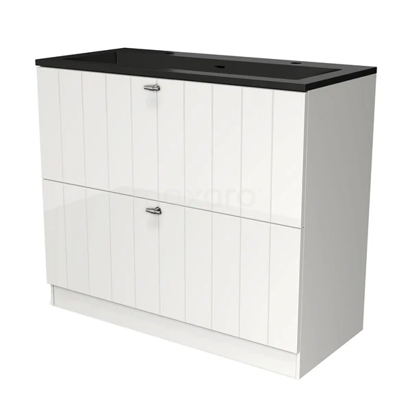 Modulo Bathroom furniture with sink | 100 cm High-gloss white Slat front Quartz 2 high drawers standing drawers under each other
