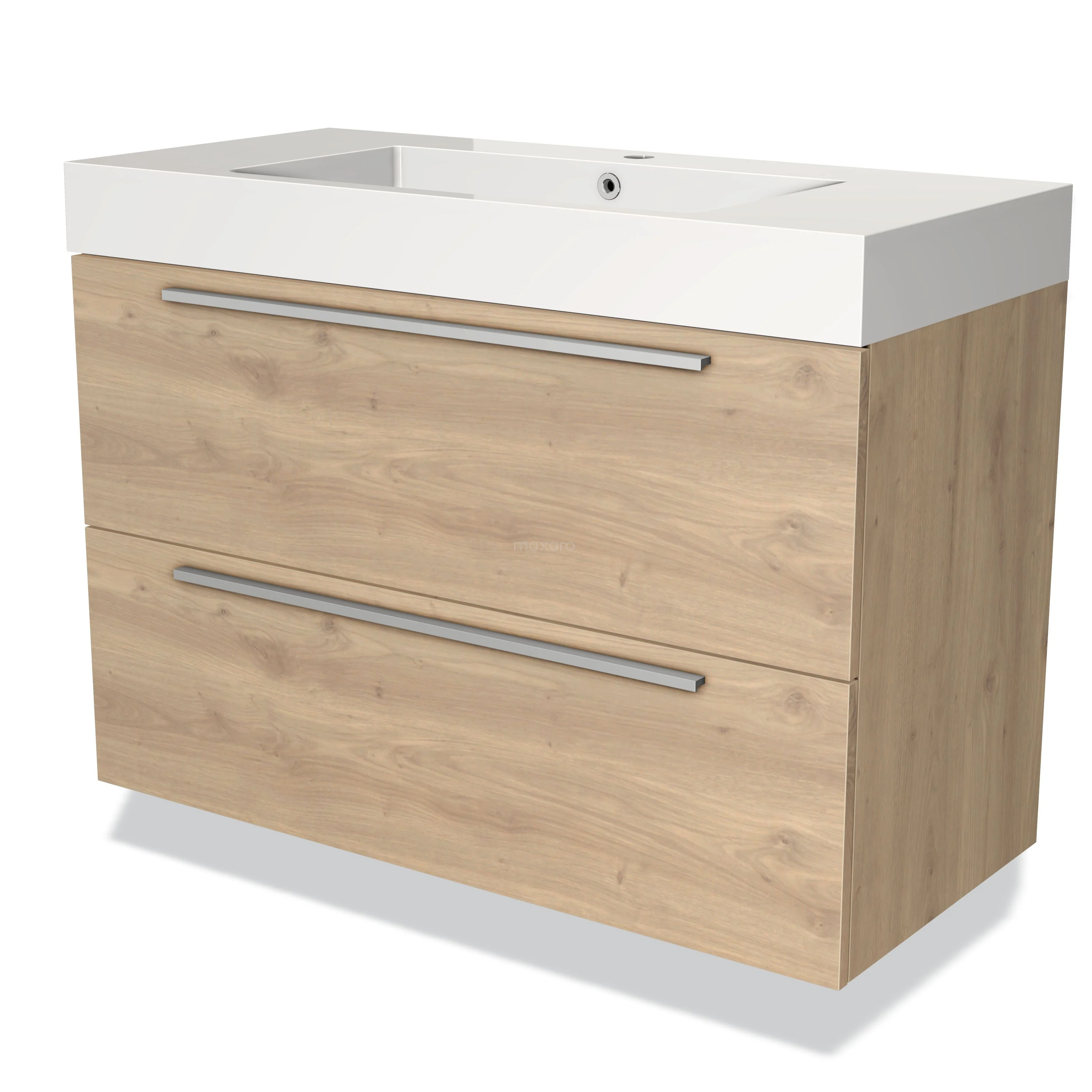 Modulo Bathroom furniture with sink | 100 cm Light brown oak Flat front Mineral marble 2 Stacked drawers