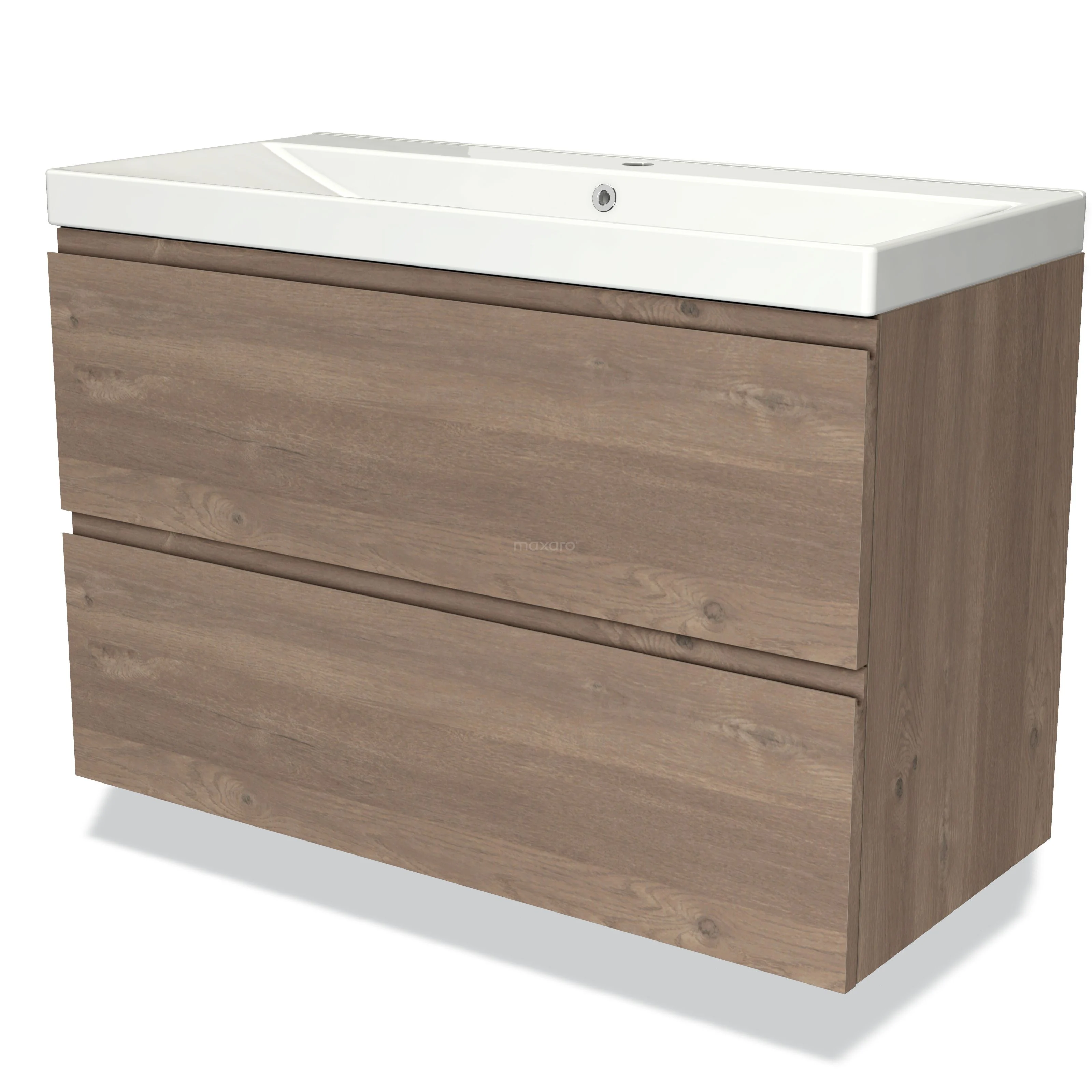 Modulo Bathroom furniture with sink | 100 cm Mid brown oak Handle-less front Ceramic 2 Stacked drawers