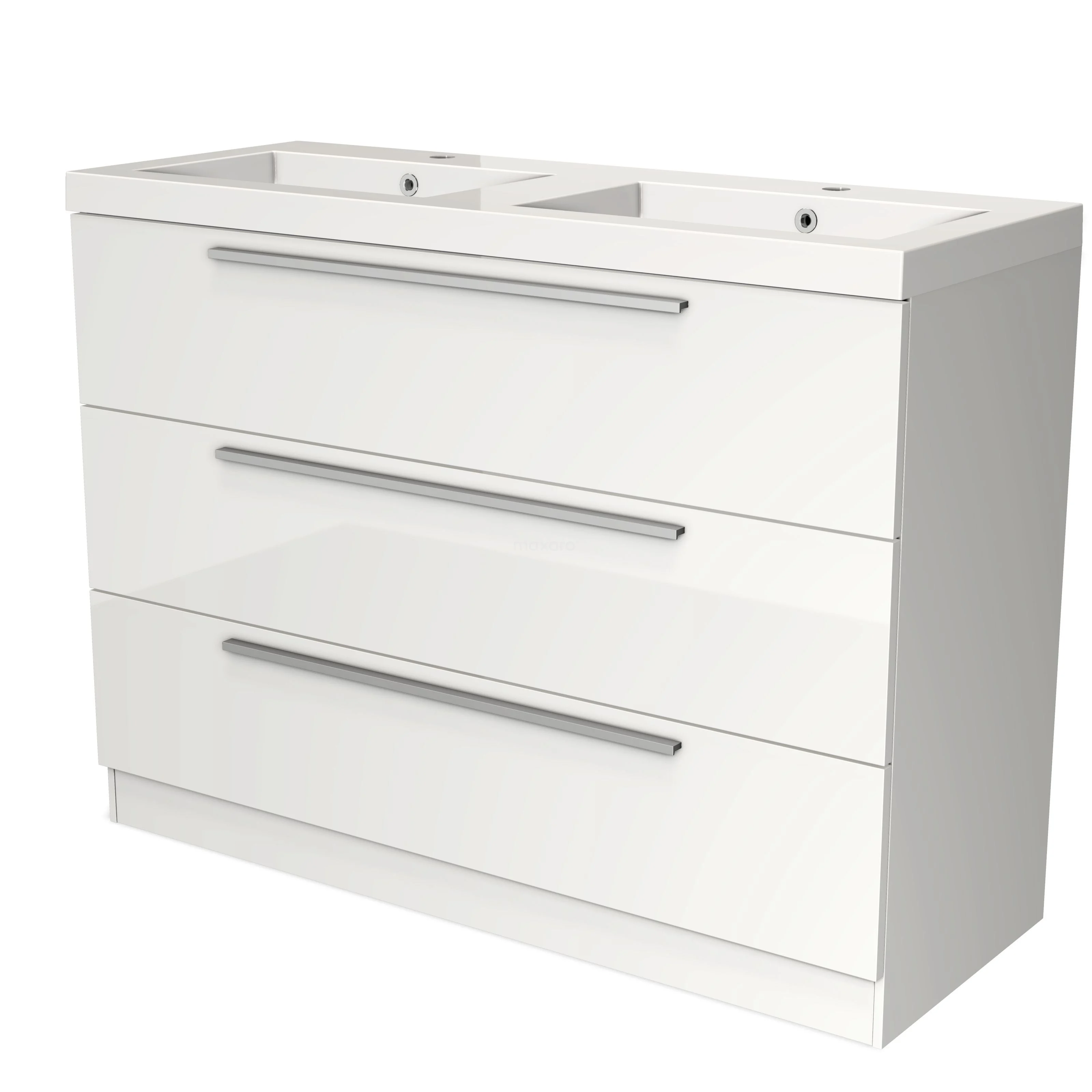 White bathroom unit with double basin, three drawers and metal handles, ideal for modern bathroom storage.