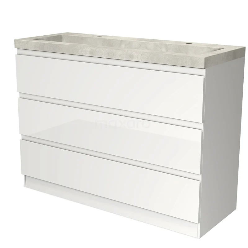Modulo Bathroom furniture with sink | 120 cm High-gloss white Handle-less front Concrete 3 standing drawers