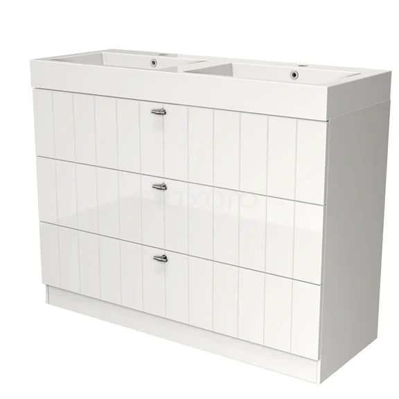 Stylish design The stylish design makes this bathroom unit the eye-catcher of your bathroom. The base cabinet features a slatted front and has a high-gloss white finish. This colour has a modern appeal and gives the unit a fresh look and feel. In addition, the slatted front adds a rustic touch. NO TEXT FOUND.