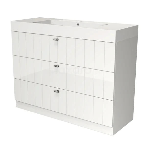 Stylish design The stylish design makes this bathroom unit the eye-catcher of your bathroom. The base cabinet features a slatted front and has a high-gloss white finish. This colour has a modern appeal and gives the unit a fresh look and feel. In addition, the slatted front adds a rustic touch. NO TEXT FOUND.