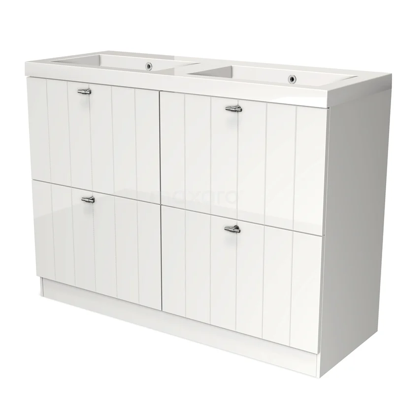 Stylish design Its stylish design makes this bathroom unit the eye-catcher of your bathroom. The base cabinet features a slatted front and has a high-gloss white finish. This colour has a modern appeal and gives the unit a fresh look and feel. In addition, the slatted front adds a rural touch. You need to add the handles yourself. These are available in different colours and shapes.