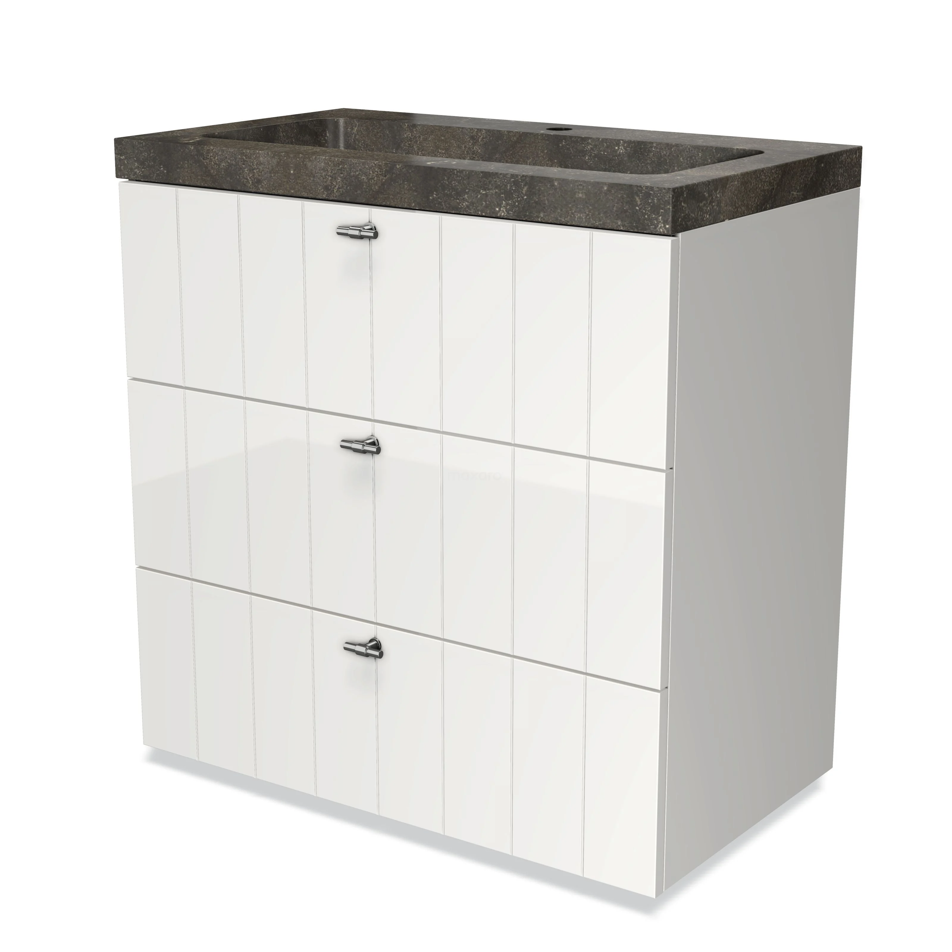 Modulo Bathroom furniture with sink | 80 cm High-gloss white Slat front Natural stone 3 drawers