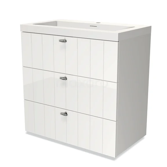 Stylish design The stylish design makes this bathroom unit the eye-catcher of your bathroom. The base cabinet features a slatted front and has a high-gloss white finish. This colour has a modern appeal and gives the unit a fresh look and feel. In addition, the slatted front adds a rustic touch. NO TEXT FOUND.