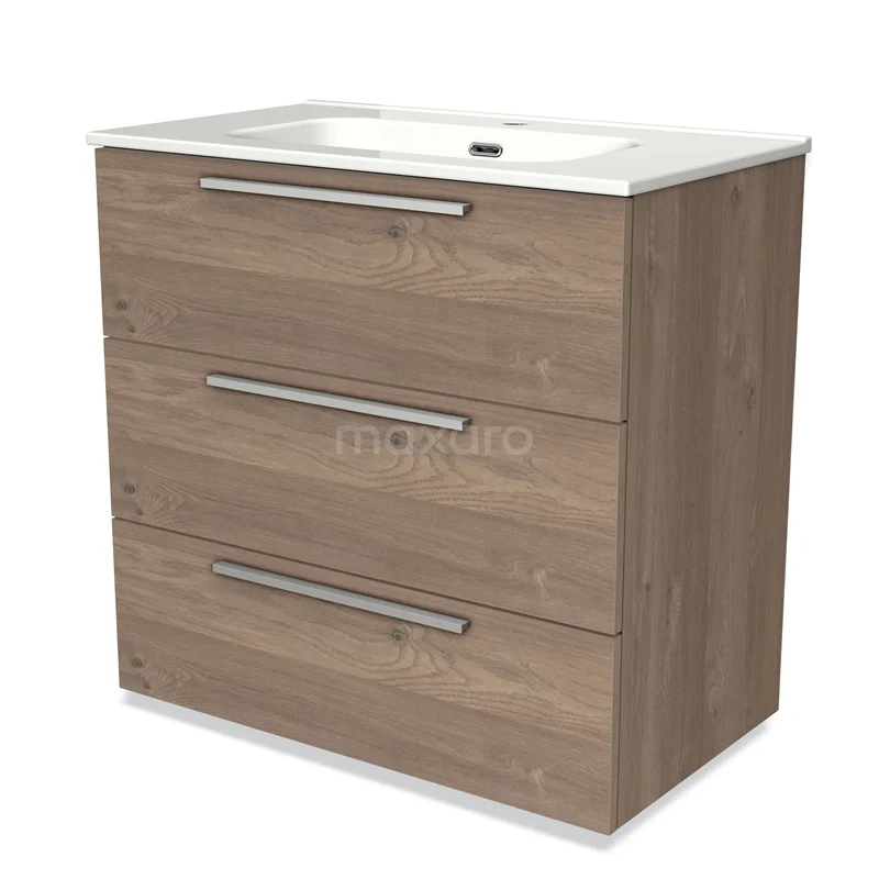 Modulo Bathroom furniture with sink | 80 cm Mid brown oak Flat front Ceramic 3 drawers
