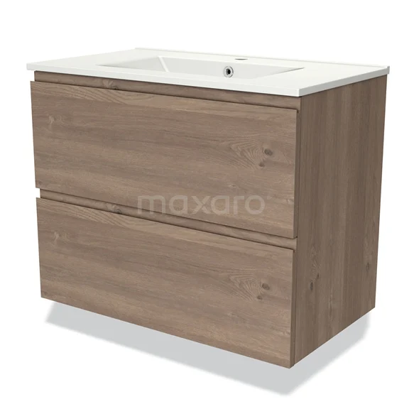 Modulo Bathroom furniture with sink | 80 cm Mid brown oak Handle-less front Ceramic 2 Stacked drawers