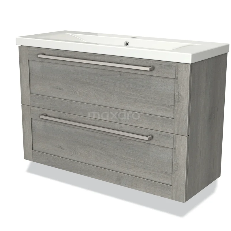 Stylish design Its stylish design makes this vanity unit the eye-catcher of your bathroom. The base cabinet features a framed front and has a grey oak finish. This beautiful oak look is an attractive addition to your bathroom interior. In addition, the framed front adds a classic touch. You will need to joint the handles yourself. These are available in different colours and shapes.