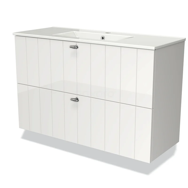 Stylish design The stylish design makes this bathroom unit the eye-catcher of your bathroom. The base cabinet features a slatted front and has a high-gloss white finish. This colour has a modern appeal and gives the unit a fresh look and feel. In addition, the slatted front adds a rural touch. You need to add the handles yourself. These are available in different colours and shapes.