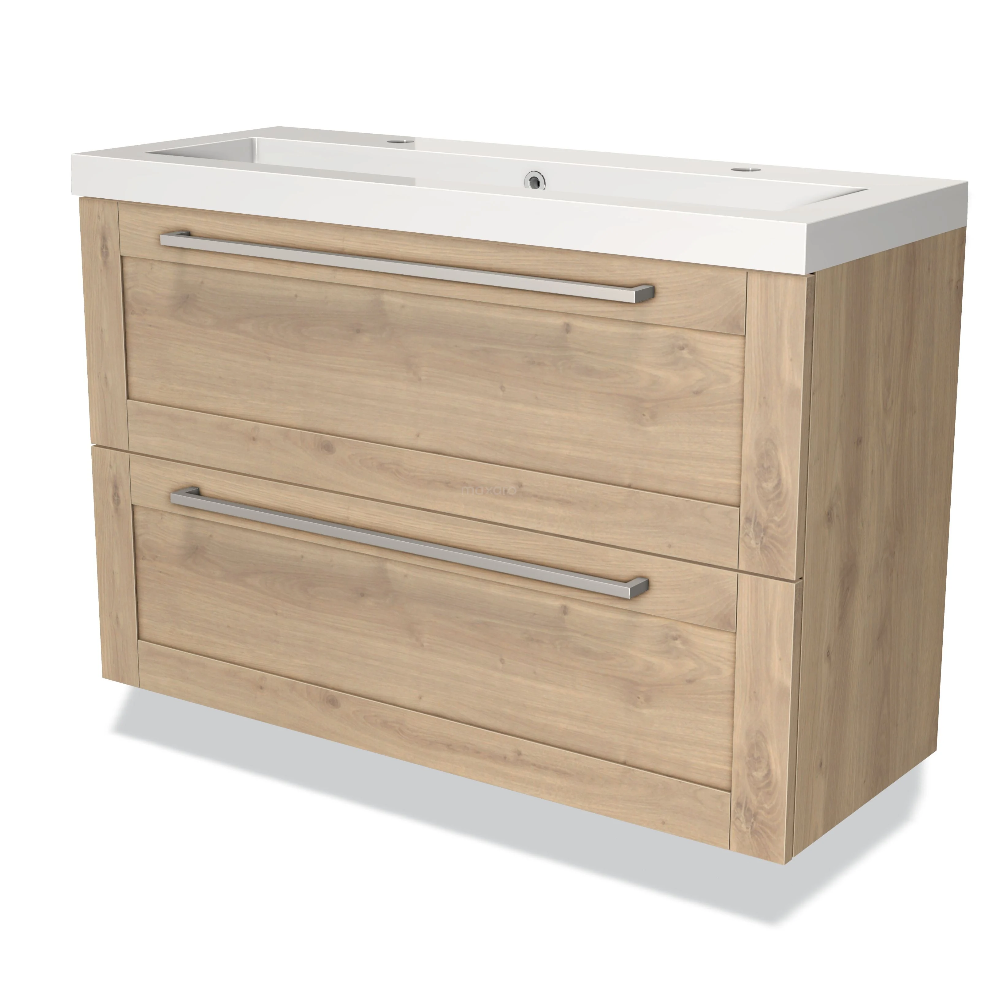 Stylish design Its stylish design makes this vanity unit the eye-catcher of your bathroom. The base cabinet features a framed front and has a light brown oak finish. This beautiful oak look creates a warm atmosphere in your bathroom interior. In addition, the framed front provides a classic touch. You will need to joint the handles yourself. These are available in different colours and shapes.
