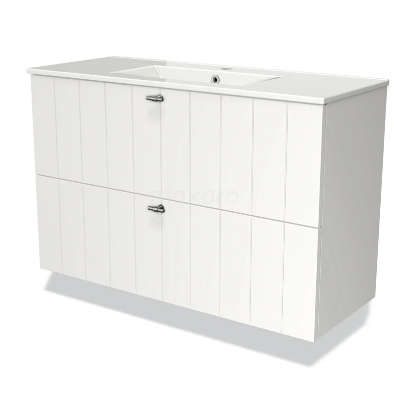 Stylish design The stylish design makes this bathroom unit the eye-catcher of your bathroom. The base cabinet features a slatted front and has a matte white finish. This colour has a modern appeal and gives the unit a fresh look and feel. In addition, the slatted front adds a rural touch. You need to add the handles yourself. These are available in different colours and shapes.