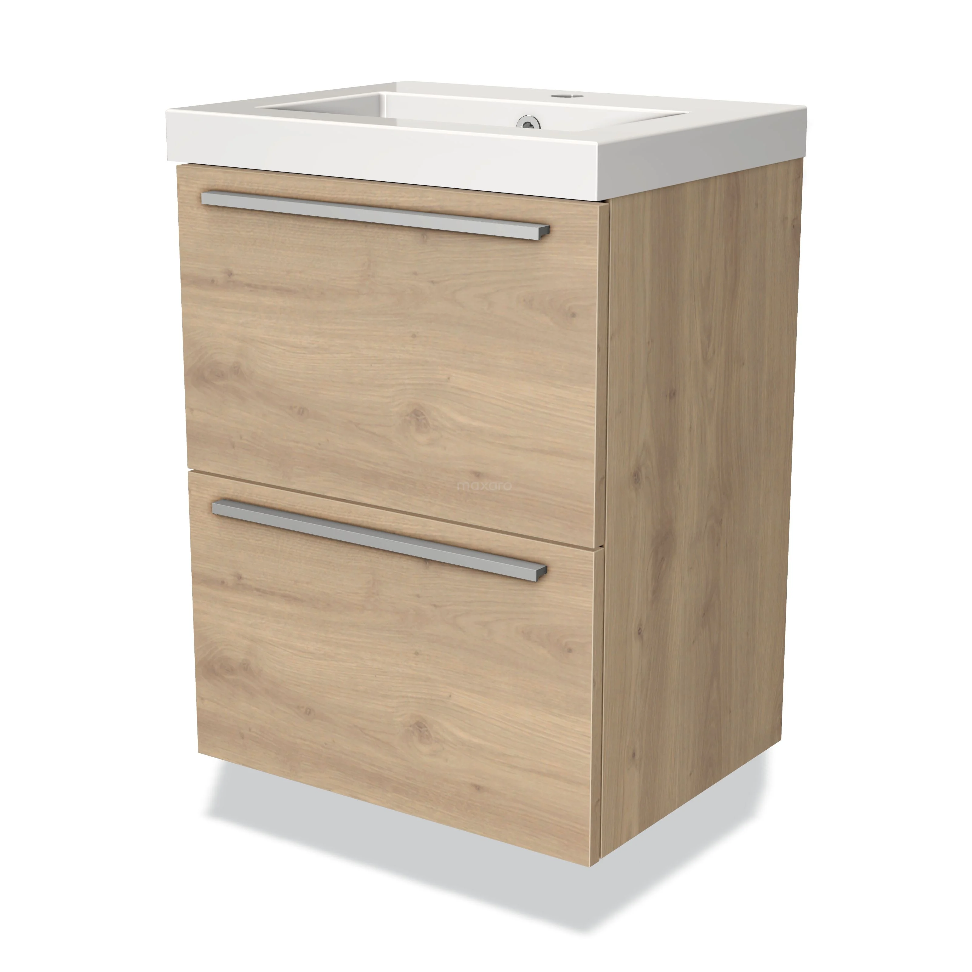 Stylish design Its stylish design makes this vanity unit the eye-catcher of your bathroom. The base cabinet features a flat front and has a light brown oak finish. This beautiful oak look creates a warm atmosphere in your bathroom interior. In addition, the flat front provides a timeless touch. You will need to joint the handles yourself. These are available in different colours and shapes.