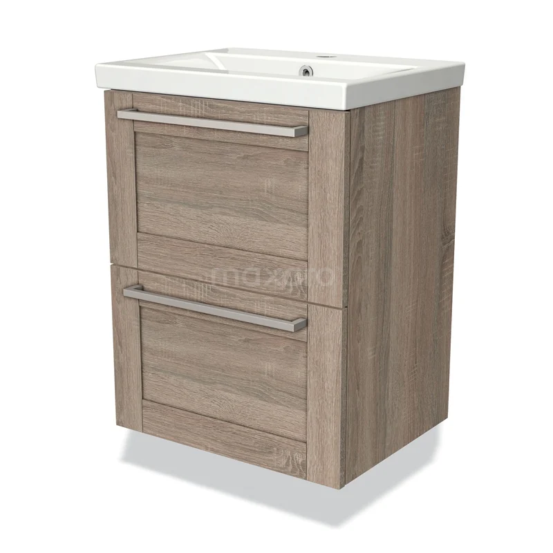 Stylish design Its stylish design makes this vanity unit the eye-catcher of your bathroom. The base cabinet features a framed front and has an oak finish. This beautiful oak look creates a warm atmosphere in your bathroom interior. In addition, the framed front adds a classic touch. You need to joint the handles yourself. These are available in different colours and shapes.
