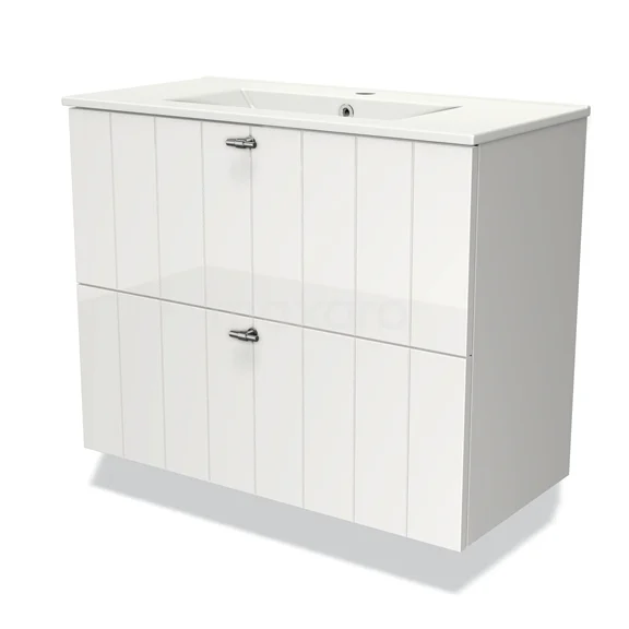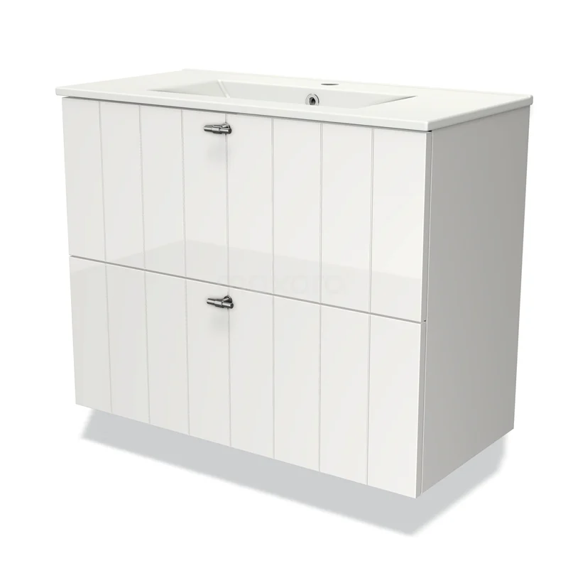 Stylish design The stylish design makes this bathroom unit the eye-catcher of your bathroom. The base cabinet features a slatted front and has a high-gloss white finish. This colour has a modern appeal and gives the unit a fresh look and feel. In addition, the slatted front adds a rural touch. You need to add the handles yourself. These are available in different colours and shapes.