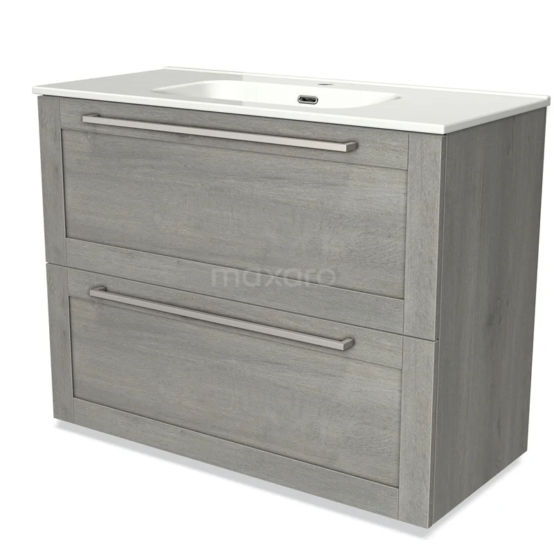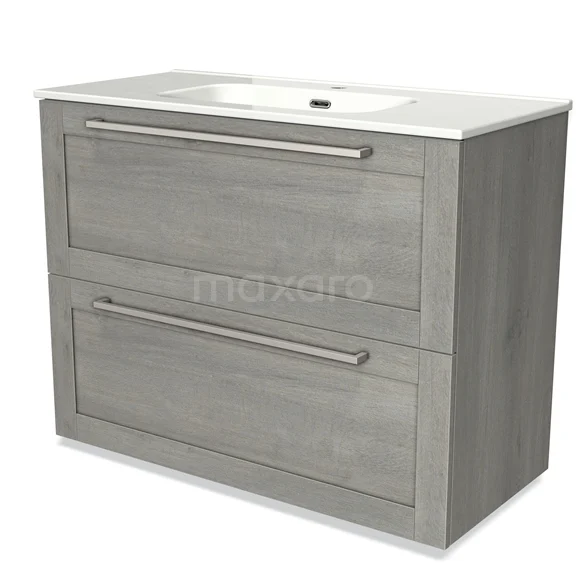 Modulo Vanity units with basin | 100 cm Grey oak Frame front Ceramic 2 stacked drawers under each other